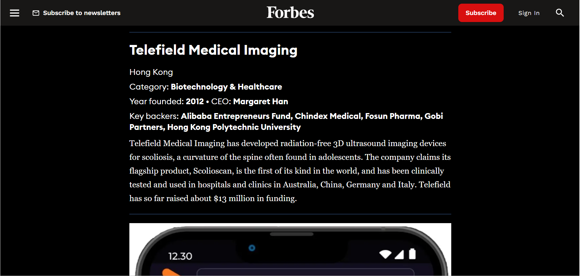 Telefield Medical Imaging has been ranked among “Asia-Pacific’s small companies and startups on the rise” by the Forbes Asia 100 to Watch 2023 list for our flagship Scolioscan, which is the first of its kind in the world. Scolioscan integrates ultrasound, artificial intelligence and positioning technologies to achieve radiation-free and three-dimensional imaging of the spine.