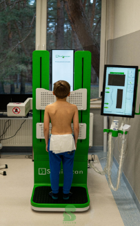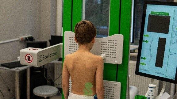Scolioscan device can be operated without the need for a darkened room. During the examination, the room remains well-lit, creating a comfortable and secure environment for the patient. Additionally, its safety allows for repeated use during therapy.