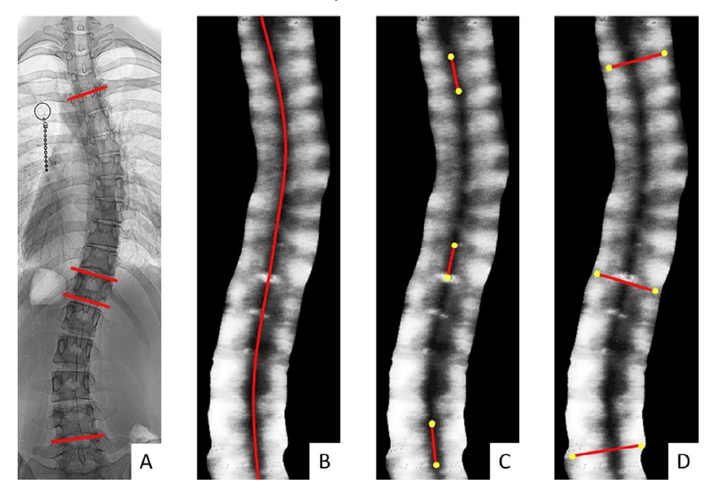 这项2018年的科研项目使用中心频率7.5 MHz、探头宽度7.5 cm的Scolioscan®SCN801设备进行扫描,Scolioscan®配套软件Scoliostudio从体投影图像中提取骨头特征,根据棘突阴影自动划线,测量出自动棘突角(下图B),手动棘突角(下图C)和手动横突角(下图D)则根据胸椎/腰椎的骨头阴影划出两条最倾斜的线再计算得出。33位患者包括男性和女性,他们脊柱侧弯的Cobb角范围在3°~90°之间。