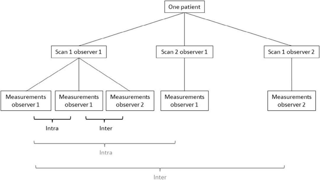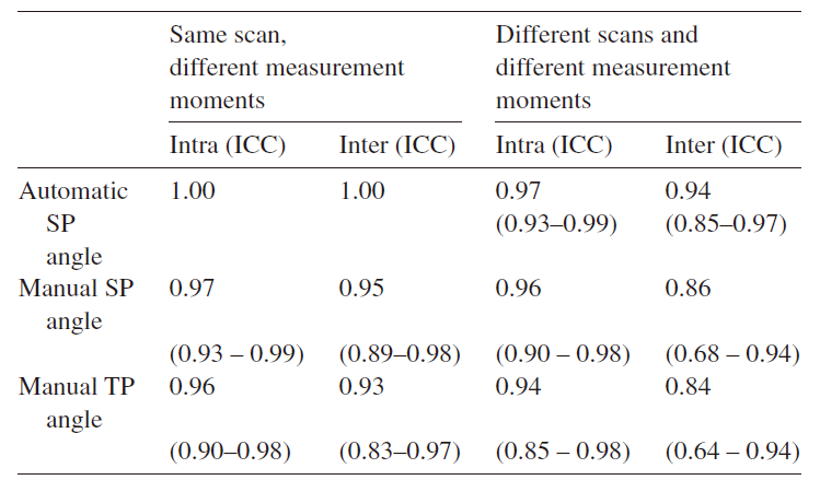 每位患者总共接受三次Scolioscan®扫描。观察者1扫描两次,观察者2扫描一次,两名观察者分别对自己扫描一次的影像进行一次角度测量;至于观察者1额外扫描一次的影像,观察者1测量两次,观察者2测量一次。通过对测量结果的统计分析,研究团队在考虑(上图黑色标记)和不考虑(上图灰色标记)扫描差异的两种情况下分别衡量同一观察者两次测量之间以及两个观察者之间的差异性。