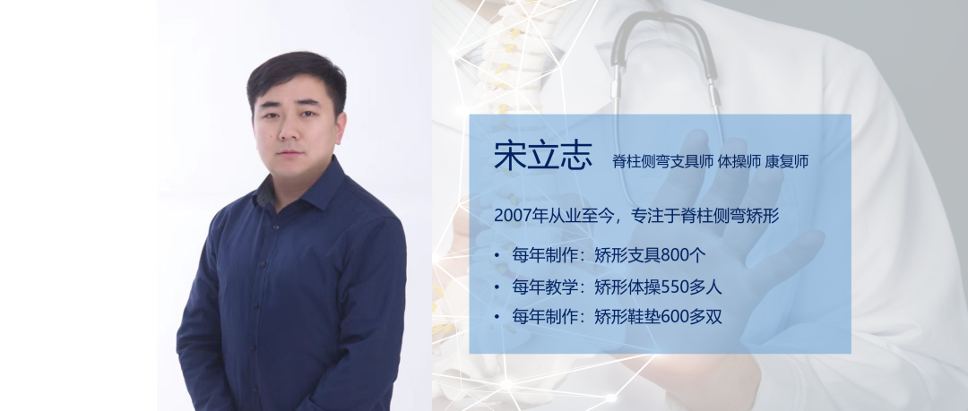 宋立志医生简介:原解放军306医院骨科支具中心主任。 从业以来一直致力于脊柱侧弯及常见骨关节疾病辅具的制作研发,拥有三项矫形器设计专利。 截至2021年10月31日,已亲自制作脊柱侧弯支具8500余例。 多年的临床经验积累出一套针对脊柱侧弯保守治疗的完整治疗方案。