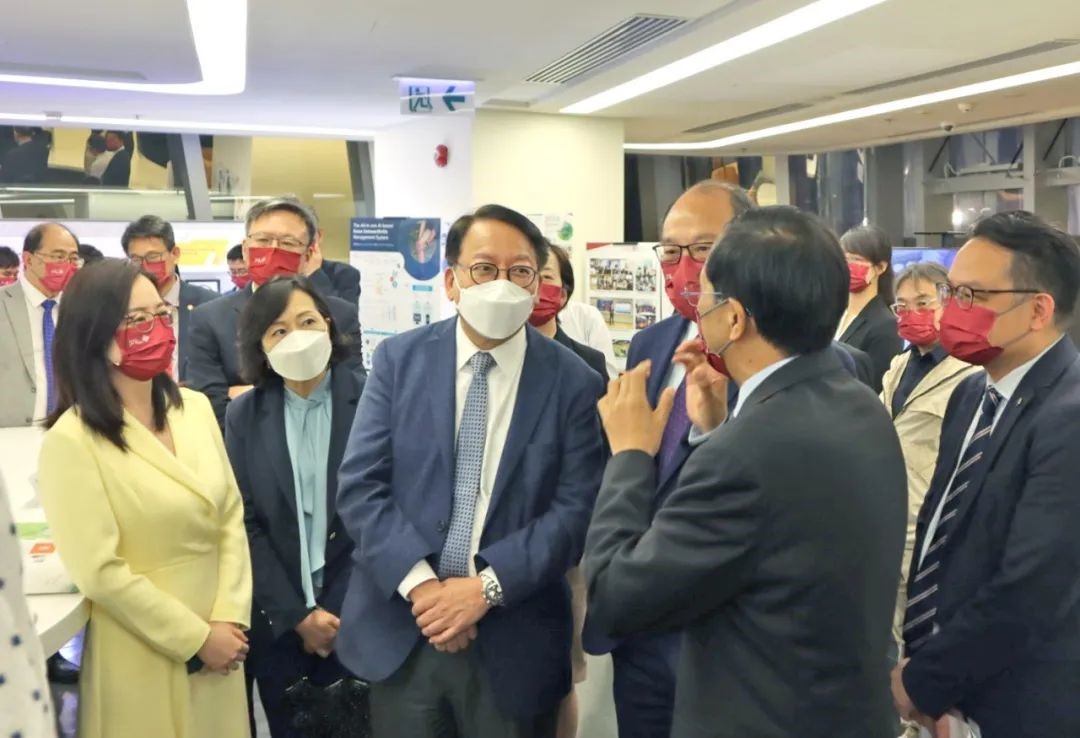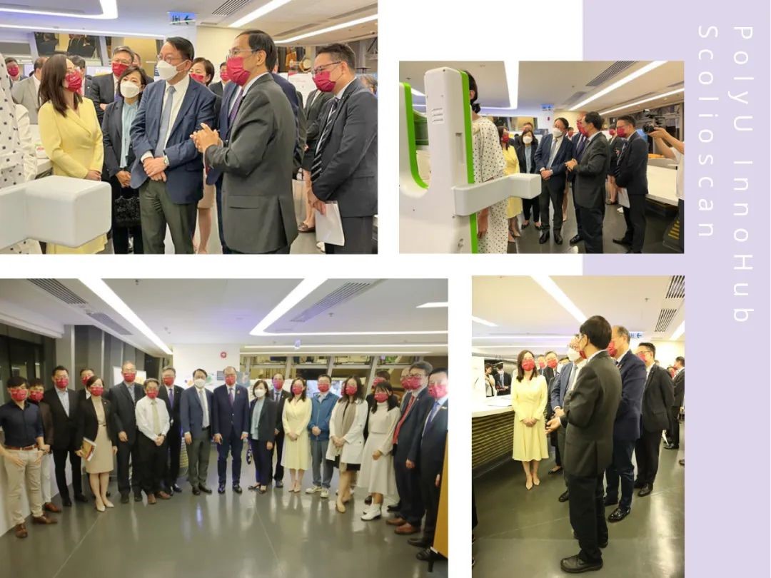 2022年11月3日,在香港理工大学赛马会创新楼,中慧医学成像有限公司作为香港理工大学优秀创新创业企业代表,联合创始人郑永平教授与CEO韩明珠女士向香港政务司司长陈国基、民政及青年事务局局长麦美娟一行介绍Scolioscan®三维超声脊柱侧弯评估系统。