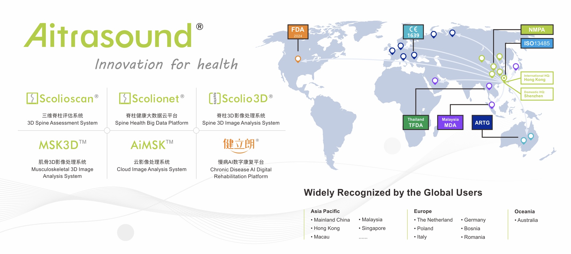 今年正值中慧医学成像开创新局之年——公司近日宣布完成Pre-A轮近6000万港币融资,并正式发布全新集团品牌Aitrasound®,标志从一家创新医疗器械医疗技术公司升级为慢病筛诊治一体化的创新医疗技术服务平台。Aitrasound®融合AI(人工智能)和Ultrasound(超声波)技术,在脊柱侧弯等多个慢病领域进行AI智能三维超声影像诊断,致力于实现“3D医学影像随时、随地、任何人可用”的愿景。