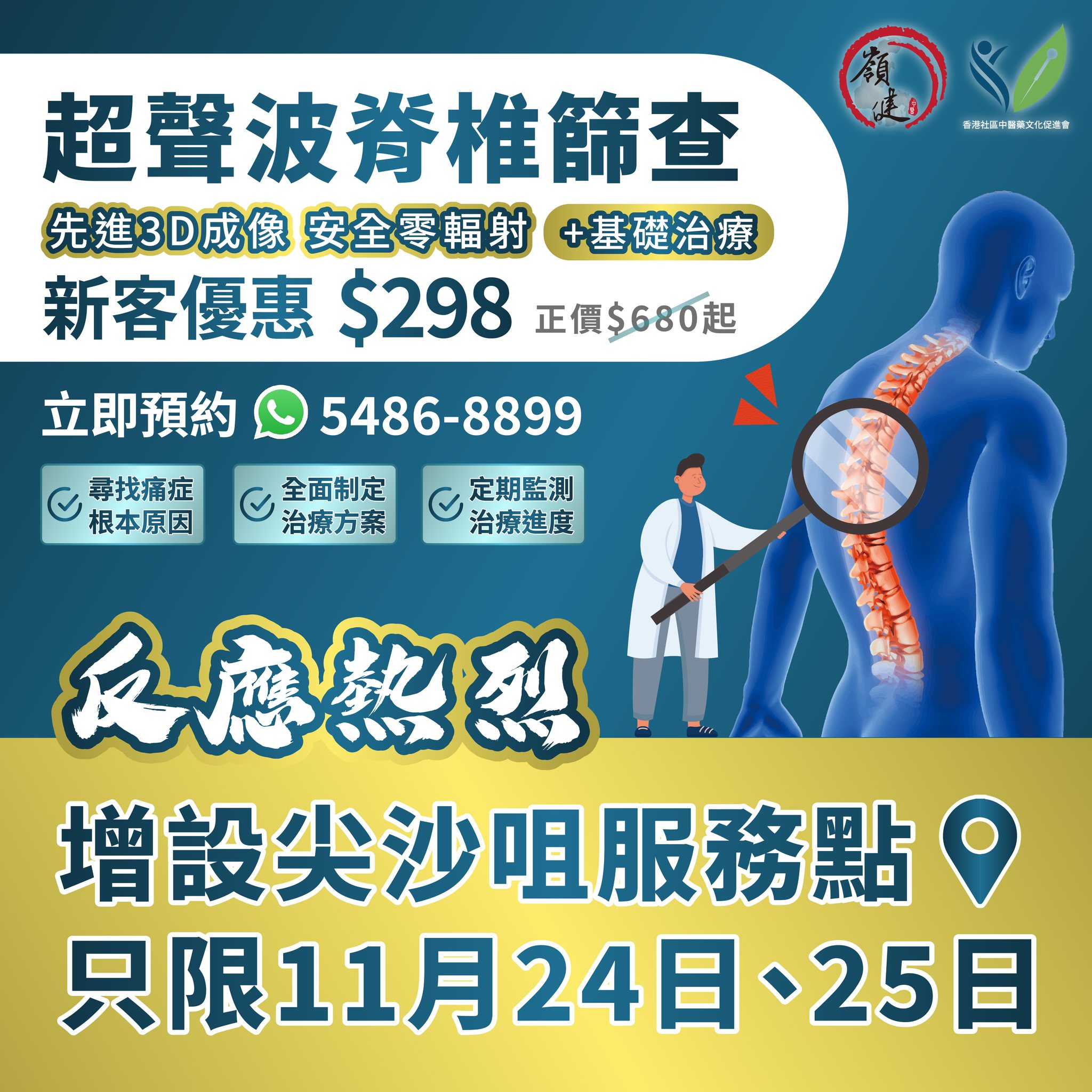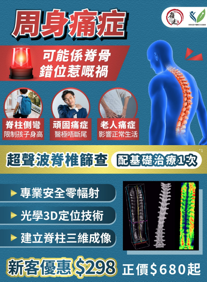 领健中医使用Scolioscan® SCN201便携式三维超声脊柱侧弯评估系统,对疼痛人群进行脊柱健康检查以确定根本病因源于肌肉还是脊柱。三维超声结合了超声和光学追踪定位技术,显示背部脊柱的整体影像,从而帮助检查者及早侦测出脊柱问题,更直观地了解病况。